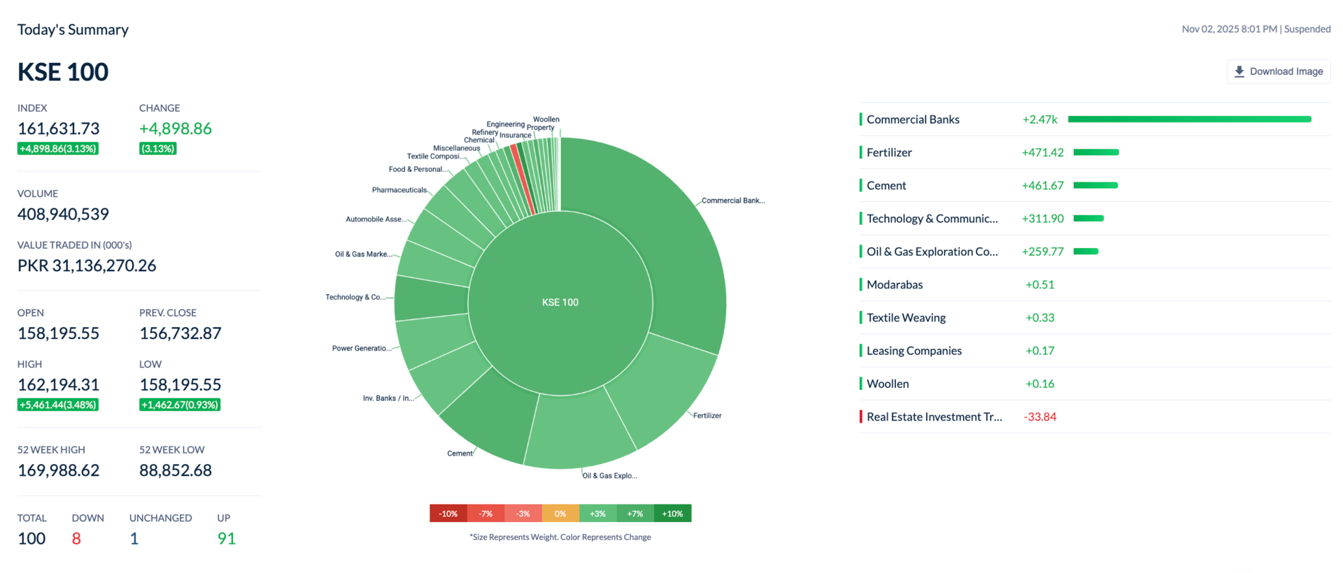The Pakistan Stock Exchange (PSX) staged a powerful recovery at the end of the outgoing week, with the benchmark KSE-100 index surging 4,899 points, or 3.13%, on Friday to close at 161,632, marking one of its strongest single-day rebounds in recent sessions. On a week-on-week (WoW) basis, the index registered a decline of 1,672 points/ 1.02%.