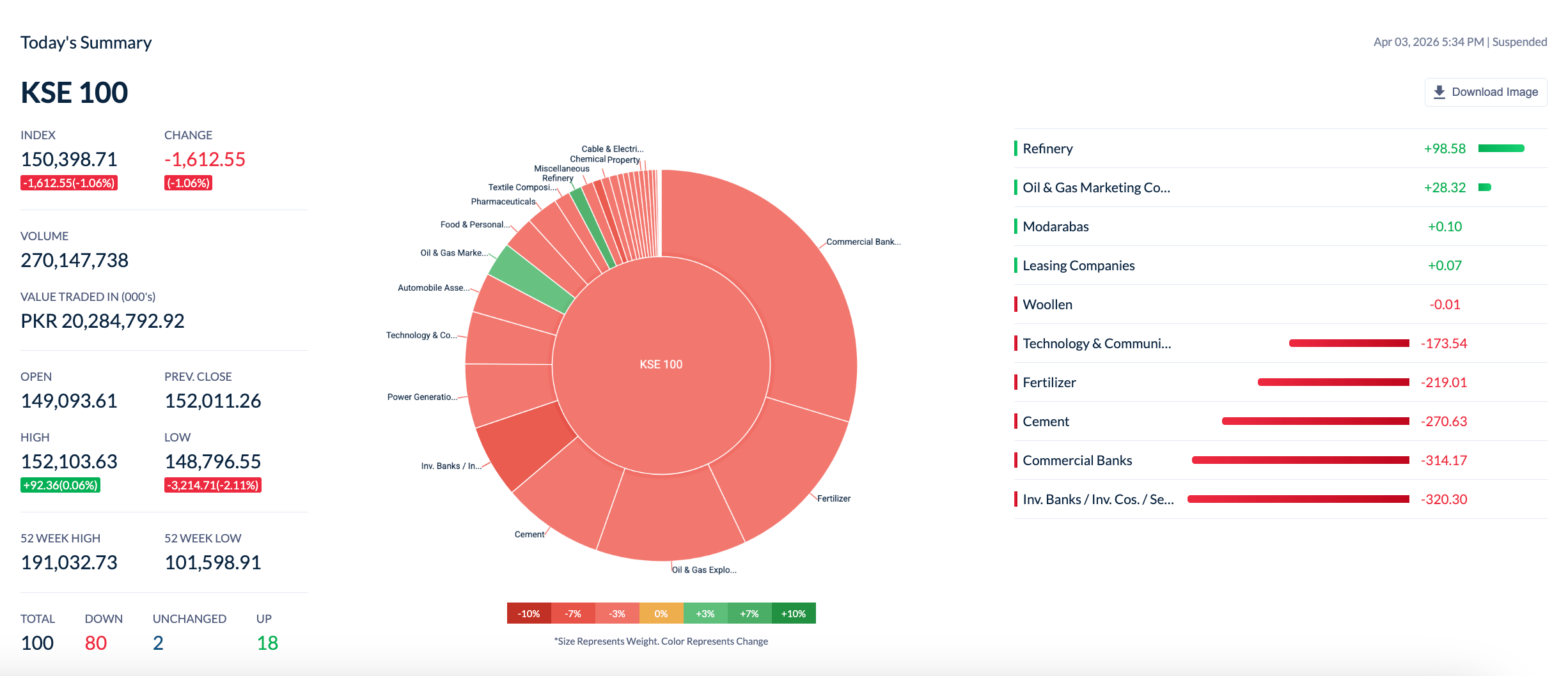 Pakistan’s stock market faced another challenging week, with investor sentiment weighed down by ongoing geopolitical tensions and rising global oil prices. The benchmark KSE-100 Index closed at 150,399, down 1,309 points or 0.9% week-on-week. Volatility remained a constant feature, as uncertainty from global and regional developments fueled persistent selling pressure throughout the week.