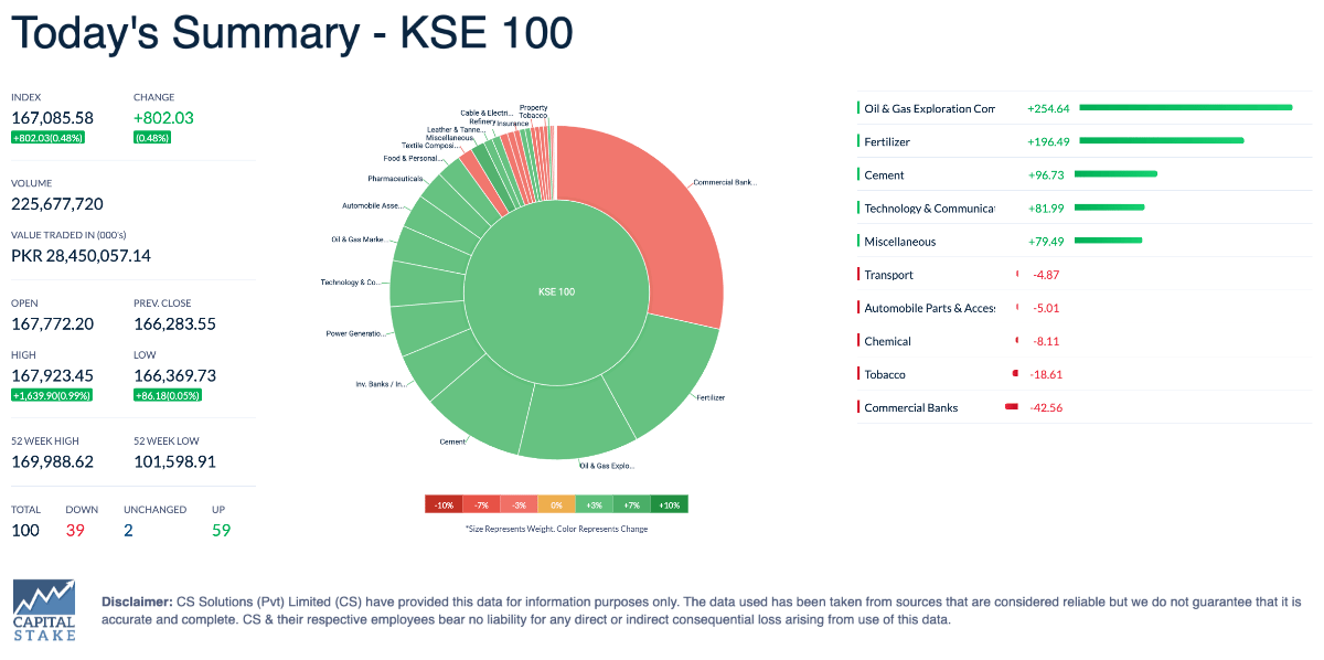 The Pakistan Stock Exchange had a relatively calm week, with the KSE-100 index showing modest gains. After a week of mixed economic news and updates on external financing, the index managed to close above the 167,000 mark at 167,086, up a total of 802 points, or 0.48%. Investors stayed cautious, keeping the market steady, as the exchange continued its consolidation phase without any major swings.