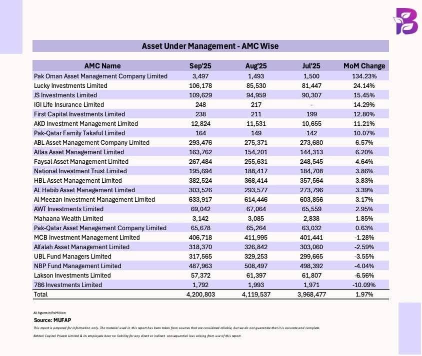 Pak Oman Asset Management, Lucky Investments, and JS Investments recorded the strongest month-on-month AUM growth — reflecting solid investor confidence and market momentum.