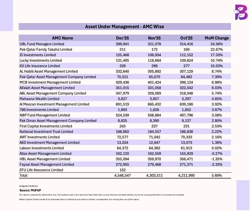 While the “Big Three” – Al Meezan Investment Management Limited, NBP Fund Management Limited, and MCB Investment Management Limited – continue to anchor the market, December showed some incredible growth from other players:
